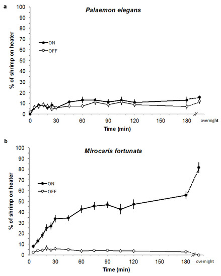 Two-choice experiment (on vs off heating thermostats) on Mirocaris fortunata and Palaemon elegans. Distribution of M. fortunata (a) and P. elegans (b) on the on and off thermostats over time. Two batches of 28 and 19 M. fortunata were tested 6 times each (n = 12 replicas per point, except overnight, n = 4 replicas). Two batches of 20 P. elegans were tested 4 times each (n = 8 replicas per point, except overnight, n = 4 replicas). The thermostats either on (set to 25 °C) or off were introduced on each side of the rearing tank (9 °C) in the upper region. The shrimp were observed for 30 min. The on and off thermostats were inverted between two consecutive trials. The distribution is presented as mean % individuals (± S.E.M.) on each thermostat.