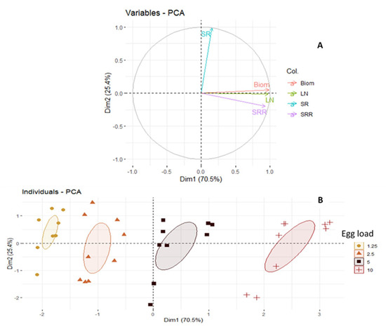 The correlation circle obtained from the PCA based on the first two axes explains the relationship between the measured variables (Figure 1A) and shows the discrimination of egg load (Figure 1B) according to the measured variables. The first two dimensions explain 95.7% of the total information, with 70.3% for dimension 1 and 25.4% for dimension 2 (Figure 1A). SR is positively correlated with dimension 2 (correlation coefficient greater than 0.5), while larval biomass (Biom), number of larvae (LN) and substrate reduction (SRR) are positively correlated with dimension 1 (correlation coefficient greater than 0.5) and are also positively correlated with each other (Figure 1A). However, SR is an independent variable from the other three variables (Figure 1A). The dimension 2 (Figure 1B) discriminates well the egg loads according to its increasing order. The four egg loads were clearly differentiated from each other, the 1.25 mg and 2.5 mg loads are significantly close to each other, while the 10 mg load is well distinguished from all other egg loads (Figure 1B). The 5 mg load is closer to the 2.5 mg and 10 mg loads than to the 1.25 mg load.