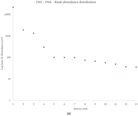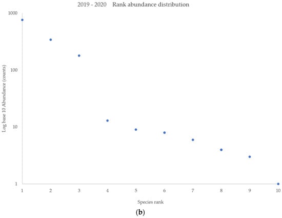 Rank abundance distributions for the (a) 1943–1944 survey and (b) 2019–2020 survey. Steep gradients are observed in both the 1940s and the present-day surveys, indicating low species evenness due to the much higher abundances of species ranked 1–4 in the 1940s and species ranked 1–3 in the present-day survey.