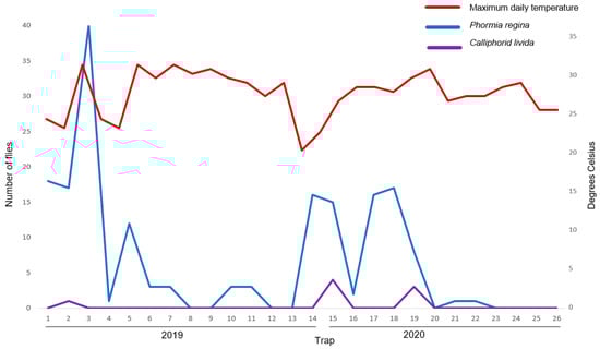 Maximum daily temperature and Phormia regina and Calliphora livida numbers for 2019–2020 traps.