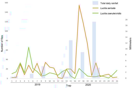 Total daily rainfall and Lucilia sericata and Lucilia coeruleiviridis numbers for 2019–2020 traps.