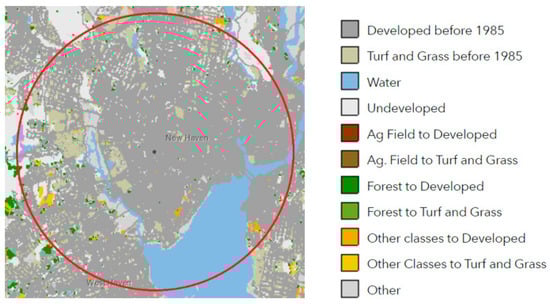 The USGS topography map of New Haven from 1892 shows that New Haven was already an established city by 1900. The USGS topography map of New Haven from 1954 shows the original coastline, and the 1954 land cover map shows the majority of land in the 5 km buffered area as developed and a change in coastline. Comparative land cover data from 1985 to 2015 show that the changes in landcover have been minimal in this 30 year period, with only small areas of forest changing to developed and other classes changing to turf and grass (Figure 4). Land cover has changed little across the state of Connecticut from 1985 to 2015 with a 3.1% increase in developed land, a 1.6% increase in turf and grass, a 3.5% decrease in forested land, and a 1.4% decrease in agricultural fields. In this 30 year period, New Haven has gained 275 acres of developed land and lost 152 acres of forested land [50] (Figure 5).