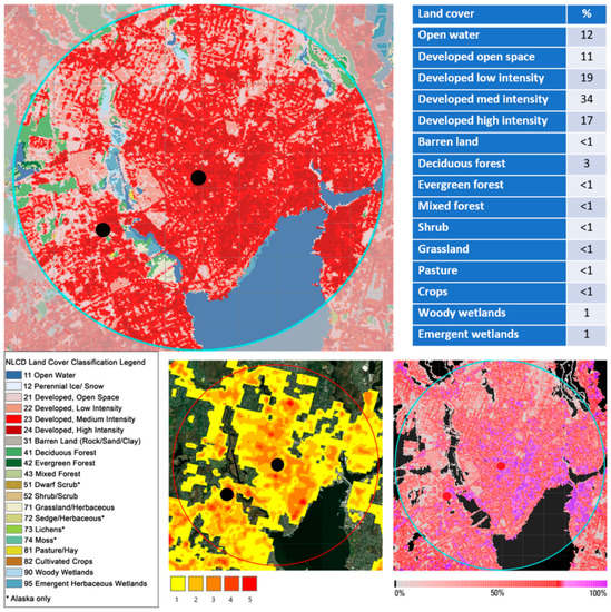 Present-day land cover analysis described the land in the 5 km buffer as 81% developed, 12% open water, and 3% deciduous forest, with all other land cover categories at 1% or less, and 51% of the developed surfaces having an imperviousness percentage above 50% (68% above 25% and 22% above 75%). Heat island data categorized over half of the buffered area as slightly hotter than the mean for the city, with multiple spots categorized as significantly higher (Figure 6). Tree canopy percentage is low at 16% at the original trap location [55].