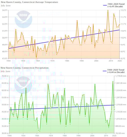 Average temperature (a) and precipitation (b) in New Haven County, Connecticut, from 1944 to 2020 (NOAA).
