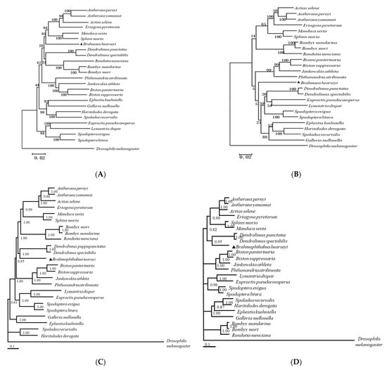 Yang, S.; Gao, S.; Cai, S.; Zou, Z.; Xin, T.; Xia, B. The Primary Complete Mitochondrial Genome of the Lappet Moth Brahmophthalma hearseyi (Lepidoptera: Brahmaeidae) and Related Phylogenetic Analysis. Insects 2021, 12, 973. https://doi.org/10.3390/insects12110973