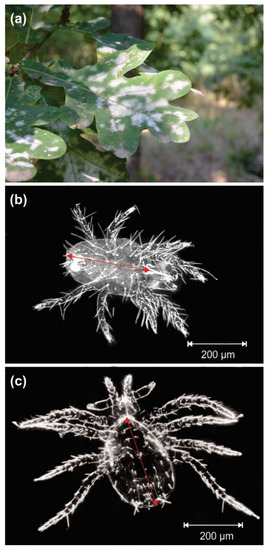(a) White powdery patches of Erysiphe alphitoides on the upper side of a Quercus robur leaf, and dorsal side of adult females of (b) the phytophagous mite Schizotetranychus garmani and (c) the predatory mite Euseius finlandicus. Red arrows indicate idiosoma length.