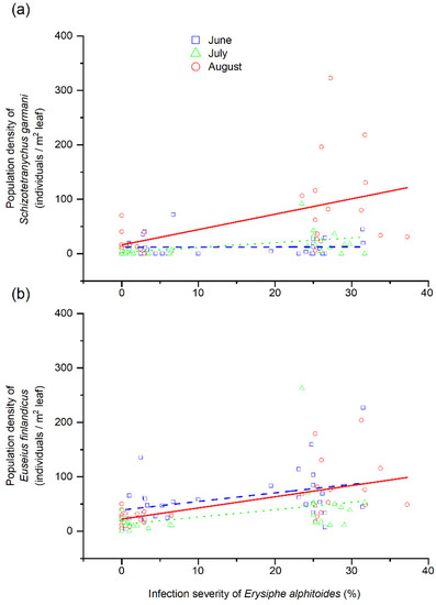 Relationships between severity of powdery mildew (Erysiphe alphitoides) in Quercus robur leaves and (a) population density of the phytophagous mite Schizotetranychus garmani or (b) population density of the predatory mite Euseius finlandicus. Severity ranged from 0 to 100, corresponding to an infected leaf area percentage of 0 to 100%. Circles, squares and triangles represent mean values at the tree level for June, July and August, respectively.