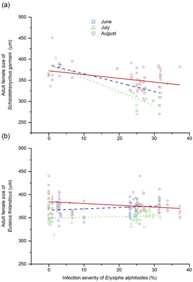 Relationships between severity of powdery mildew (Erysiphe alphitoides) in Quercus robur leaves and adult female idiosoma size of (a) the phytophagous mite Schizotetranychus garmani or (b) the predatory mite Euseius finlandicus. Severity ranged from 0 to 100, corresponding to an infected leaf area percentage of 0 to 100%. Circles, squares and triangles represent mean values at the tree level for June, July and August, respectively.