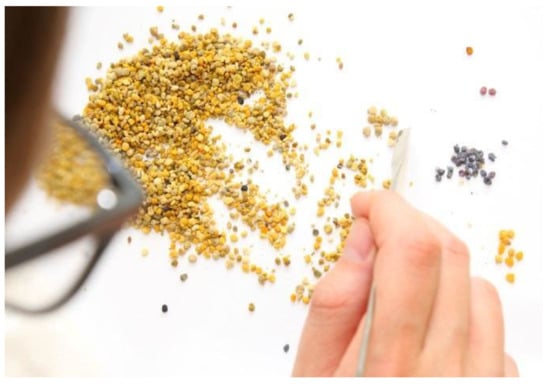 Sorting corbicular pollen loads collected in pollen traps by color using a spatula. Photo: Bernd Niederkofler.