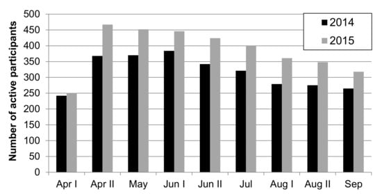 Number of active citizen scientists per sampling in 2014 and 2015.
