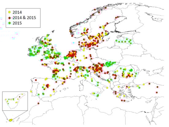 Overall, 750 beekeepers from 24 countries participated over the two years. In total, 300 of these beekeepers participated in both years, 165 beekeepers collected pollen in 2014 only (making a total of 465 beekeepers in 2014), and 285 beekeepers collected pollen in 2015 only (making a total of 585 beekeepers in 2015; see Table A2). The participation of citizen scientists (number of active participants) in each sampling of the two years is shown in Figure 3. As we had separate regional coordinators for Tenerife, England, Northern Ireland, Scotland, and Wales, we here present results from 28 different regions. Our sampling area covered 24 regions in 2014 and 27 regions in 2015. The location of the apiaries of participants is shown in Figure 4. We received records of a total of 8094 sampling events in 2014 and a total of 9823 in 2015.