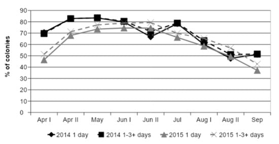 In 2014, 72.2% (n = 7516) of the collected samples met the required 20 g and 68.3% in 2015 (n = 9048). The percentage of successful pollen trappings (bees collected more than 20 g) followed a seasonal pattern. This seasonal pattern was also observed for samplings collected exactly within one day and sample collections lasting between one or three and more days (Figure 5). More than half of the samples (58.2%) were collected by trapping pollen on one day, 20.5% for two days, 16.8% for three days, and 4.5% of the samples were obtained by trapping pollen for more than three days (n = 16,564 colonies).