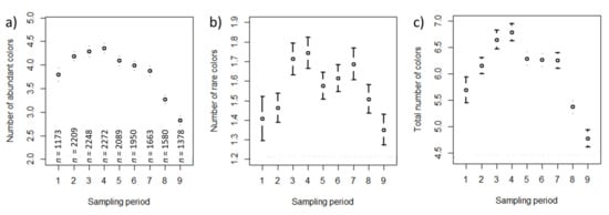 The mean numbers of abundant, rare, and total colors per sampling period also followed a seasonal pattern and are shown in Figure 6a–c.