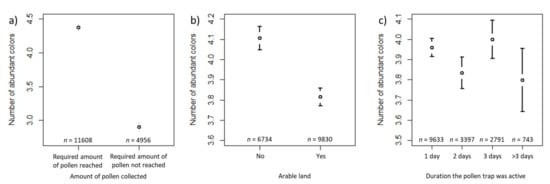 The number of abundant colors decreased by a factor of 0.703 (Table 1) for the samples where the required amount of pollen was not reached compared to samples where the required amount of pollen was reached (Figure 7a). In samples for which arable land surrounded the apiary, the number of abundant colors decreased by a factor of 0.940 (Table 1) compared to samples where no arable land surrounded the apiary (Figure 7b). The number of abundant colors did not differ significantly between samples collected for one day and samples collected for two or more than three days. However, the number of abundant colors increased by a factor of 1.036 in samples collected for three days, compared to the samples collected for one day (Table 1, Figure 7c). The estimated variance components of the random effects are also shown in Table 1. Of the random effects, beekeeper ID had the largest effect, and year was the smallest.