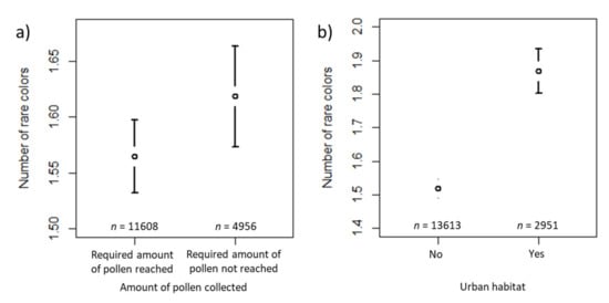 Confidence interval plots for number of rare colors as a dependent variable and habitat types according to the beekeepers’ specification as a fixed effect. Mean (and 95% CI) number of rare colors in samples where: (a) the required amount of pollen had been reached vs. samples where the required amount had not been reached; (b) urban habitat vs. rural habitat surrounded the apiary.