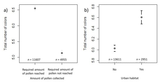 The total number of colors was significantly affected by collection (i.e., whether the required amount of 20 g pollen had been reached or not) and habitat (i.e., whether urban habitat surrounded the apiary or not; Table 3). The estimated total number of colors for a “reference” sample reaching the required amount of pollen and not having urban habitat type in the surroundings of the apiary was 6.0 (last column, Table 3). The total number of colors decreased by a factor of 0.821 for the samples for which the required amount of pollen had not been reached (Table 3) compared to those for which the required amount of pollen had been reached (Figure 9a). For samples in which urban habitat surrounded the apiary, the total number of colors increased by a factor of 1.101 (Table 3) compared to those in which the apiary was not surrounded by urban habitat (Figure 9b). The variance components of the random effects are also shown in Table 3. Again, ID of the beekeeper was the largest random effect, and year was the smallest.