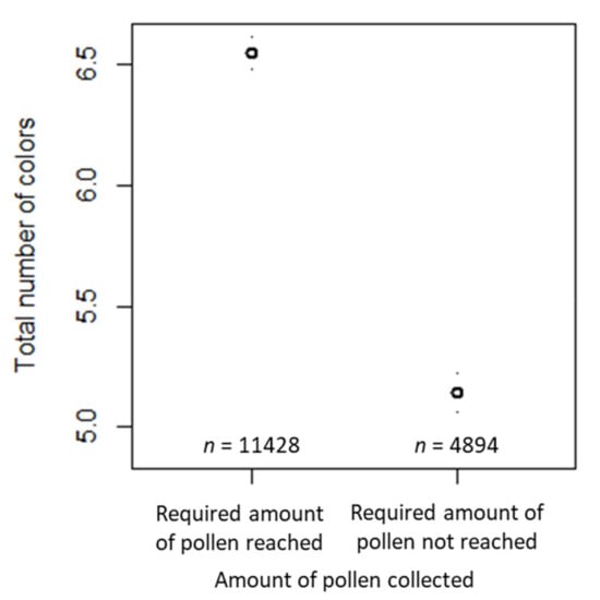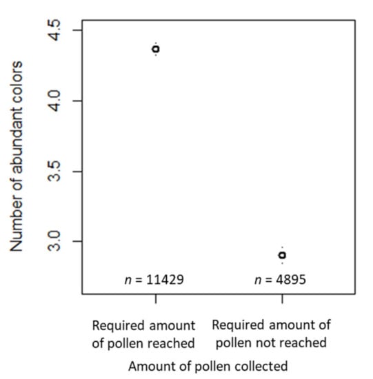 In the approximately 18,000 pollen samples, we found, on average, a total number of six colors, of which four were abundant and one was rare (Figure 6). The variation in the number of colors (in the range visible to the human eye) is therefore lower than the variability usually reported from palynological studies. A pollen sample typically contains many more pollen morphotypes that can be discriminated, although the number of those with a proportion of more than 1% of a sample can be estimated to be between 10 and 20 [,,,]. Color diversity of the pollen samples was significantly influenced by the amount of pollen collected (i.e., whether the required amount of 20 g of pollen had been reached or not) and the habitat surrounding the apiary.