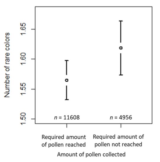 In our study, it was of great importance that all citizen scientists worked with the same, standardized amount of pollen, because the species diversity could be affected by the amount of pollen analyzed. Palynological studies using light microscopy usually analyze just a few grams of pollen [,,]. Citizen scientists in our study were instructed to determine whether bees had collected enough pollen to fill an inverted honey jar lid, a tool easily at hand for a beekeeper. This container holds about 20 g or circa 2000 pollen loads (Figure A1). As expected, the amount of pollen sampled and analyzed significantly affects the number of abundant and rare pollen colors in the sample according to all models. Samples with lower amounts as described above had more rare pollen colors, but at the expense of the number of abundant pollen colors (Figure 7, Figure 8, Figure 9, Figure 10, Figure 11 and Figure 12). Whether the required amount of pollen was reached could also be linked to the likelihood of colonies gathering enough pollen for analysis throughout the season. The pollen needs of a honey bee colony are largely determined by intra-colonial factors, such as the amount of open brood in the colonies, pollen stores, and colony strength []. Furthermore, external factors such as weather or competition with other colonies may also affect the amount of pollen collected []. Most pollen samples collected by bees in both years reached the required amount of pollen for determination of colors, but successful pollen collection was more likely in samplings between the end of April and July. Although Figure 5 shows the likelihood that bees collected the required amount of pollen as a function typical for seasonal effects, with a steep increase from April to May and a gradual decrease after sampling in late July, we must be careful regarding direct conclusions about the environmental abundance of pollen at our sampling sites. Firstly, pollen traps were not standardized in our study and probably varied greatly in their efficiency to harvest pollen [], and secondly, other factors apart from environmental availability also influence pollen collection. The seasonal effect described here was, therefore, more related to the amount of brood in the colony.