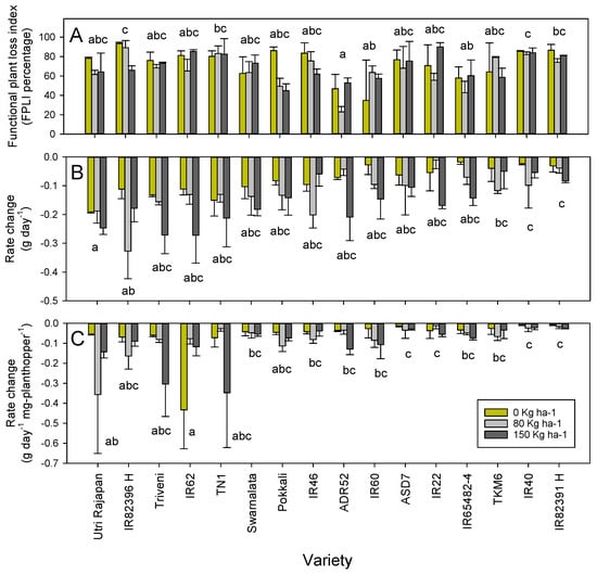(A) FPLI for 16 varieties/lines at three nitrogen levels, with (B) changes in plant growth rate between 30 and 45 DAS under three levels of soil nitrogen after infestation with planthopper nymphs and (C) corresponding growth rate changes per mg of planthopper. Error bars are indicated (N = 3). Lowercase letters indicate homogenous variety groups (Tukey p > 0.05).