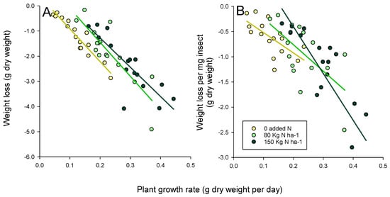 Relations between plant growth rate and (A) plant weight loss, and (B) weight loss per mg of planthopper for 16 rice varieties exposed to planthoppers under three nitrogenous fertilizer regimes (see legend). Each point is the average of three replicates. Best-fit linear models are indicated for each nitrogen level (Table 3).