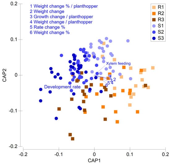 Based on the parameters obtained via the different bioassays, rice lines were compared using the permutational multivariate analysis of variance (PERMANOVA) [] on Euclidean distances calculated from normalized data. The PERMANOVA analysis included two factors; nitrogen, with three levels (1 = zero added nitrogen, 2 = 80 Kg ha−1, 3 = 150 Kg ha−1), and resistance, with two levels (whether the rice line had functioning resistance genes (i.e., other than Bph1, bph2, BPH25 or BPH26) [R] or was without major functioning resistance genes (i.e., susceptible) [S]). A canonical analysis of principal coordinates (CAP) was used to visualize the differences between the groups of rice lines [], based on the parameters obtained from the plant–insect bioassays. All multivariate analyses were conducted using PRIMER-E version 6.1.16 software with the PERMANOVA+ add-on (v. 1.0.6).