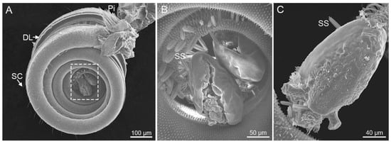 The proboscis of Protoschinia scutosa. (A) Lateral view; (B) enlarged view of the dotted rectangle in (A); (C) pollen grain on the proboscis tip. DL, dorsal legulae; Pi, pilifer; SC, sensilla chaetica; SS, sensilla styloconica.