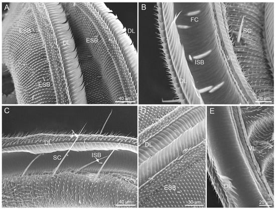 Zone 1. (A) Dorsal view of S. trifolii; (B) internal view of S. trifolii; (C,E) internal view of P. scutosa; (D) dorsal view of P. scutosa. DL, dorsal legulae; ESB, external sensilla basiconica; FC, food canal; ISB, internal sensilla basiconica; SC, sensilla chaetica; VL, ventral legulae.