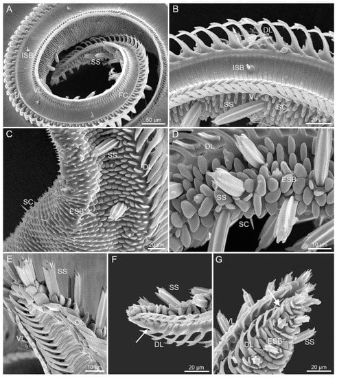 Zones 2 and 3. (A) Internal view of Zone 2 of S. trifolii; (B) internal view of Zone 2 of P. scutosa; (C) external view of Zone 2 of S. trifolii; (D) external view of Zone 2 of P. scutosa; (E) internal view of Zones 2 and 3 of S. trifolii; (F) internal view of Zone 3 of S. trifolii, with the white arrow indicating the boundary between Zones 2 and 3; (G) lateral view of Zone 3 of P. scutosa, with the white arrow indicating the boundary between Zones 2 and 3. DL, dorsal legulae; ESB, external sensilla basiconica; FC, food canal; ISB, internal sensilla basiconica; SC, sensilla chaetica; SS, sensilla styloconica; VL, ventral legulae.