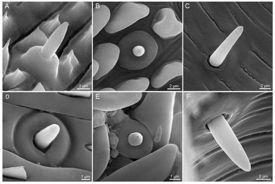 Sensilla basiconica. (A) External sensillum basiconicum on Zone 1 of S. trifolii; (B) external sensillum basiconicum on Zone 2 of S. trifolii; (C) internal sensillum basiconicum on food canal of S. trifolii; (D) external sensillum basiconicum on Zone 1 of P. scutosa; (E) external sensillum basiconicum on Zone 2 of P. scutosa showing a sensory pore at the blunt tip; (F) Internal sensillum basiconicum on food canal of P. scutosa.