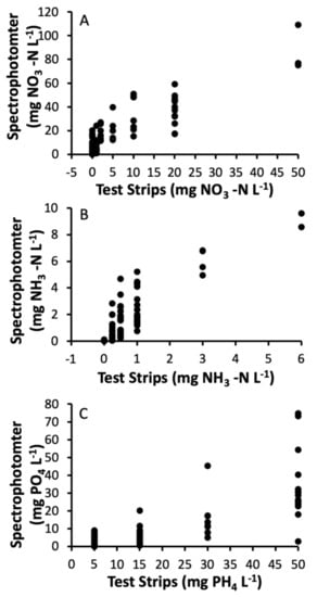 | Nutrient | Test Strip (mg/L) | Spectrophotometer (mg/L) | df | t | P | r | p | ||