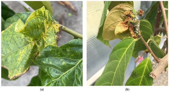 On cacao, mealybugs are economically important owing to their role as virus vectors []. Viruses are present on every continent where cacao is grown commercially, most of which belong to the Badnavirus genus. At least 11 Badnavirus species are known to infect cacao, some of which cause reduced yield or tree death []. Most research focuses on highly virulent viruses in West Africa associated with cacao swollen shoot disease (CSSVD). Infected trees experience severe yield decline and death within a few years [,]. Annual production loss due to CSSVD was estimated to be 76,000 metric tons in 2012 [].