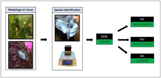 Mealybugs feeding on virus-infected trees of Theobroma cacao were identified using COI, ITS2, and 28S markers amplified and sequenced using MFCO1/MRCO1, ITS2-M-F/ITS2-M-R, and D10F/D10R primers.