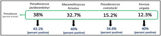 A total of 170 mealybugs were collected from pods, leaves, stems, and flowers of cacao trees in a Florida greenhouse. These trees were determined to be infected with CaMMV following nested PCR testing of three leaves per plant, followed by Sanger sequencing of amplified fragments. The detection of multiple virus strains in several trees suggests that mixed infections are common []. Four of these were discarded owing to low DNA concentrations and omitted from subsequent analyses. Three of the 20 selected trees that had no mealybugs present were omitted and were replaced with three additional, randomly selected trees. No mealybugs were found on the tree roots inspected.