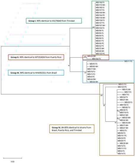 The CaMMV sequences (n = 60) generated in this study clustered into four primary groups. Groups I, II, and III shared approximately 99% sequence identity to isolates from Trinidad, Puerto Rico, and Brazil, respectively, as determined following BLASTn analysis (Figure 4). Group IV is the largest (n = 28), and shared approximately 84 to 85% nucleotide sequence identity with strains from Brazil, Puerto Rico, and Trinidad. Group I was the most genetically uniform, with no nucleotide differences among the 21 sequences. A representative subset of sequences generated in this study was deposited in GenBank and is publicly available (Supplementary File S1).