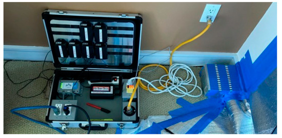 Because the C. brevis infestations at these condominiums were primarily associated with cabinets, the base cabinets with toe-kick voids were identified as one of the areas prone to slow rates of temperature increases. Because these areas can also be easily modified by pest management professionals, for improved treatment condominiums, four-inch-diameter holes were drilled in the back of all infested base cabinets with toe-kick voids (Figure 2). For each condominium, a total of three thermistor probes were placed deep inside the toe-kick voids next to the largest or deepest sidewall or baseboard to monitor and record temperatures to ensure that the heat thoroughly reached all areas, including these heat sink areas (Figure 3). Two ambient air temperature sensors were placed at recessed corners of the treatment zones. Two core temperature probes were installed by drilling to the center of the selected sidewall or side cabinet, placing them in the hole, and sealing the hole with duct tape (Figure 4A). Additionally, one custom-made wooden cube (9 × 9 × 9 cm) with an embedded sensor in layered woods, which simulated the thickness of the cabinet wood but may have been thicker than the actual cabinet wood to represent potential worst-case areas, was placed in a low-circulation location for temperature recording (Figure 4B). Temperatures from a total of eight wireless sensors were monitored from an online wireless portal (iMonnit, South Salt Lake, AZ, USA) in each treated condominium. A cellular gateway and control unit were set up in each treatment condominium to collect the thermistor probe and sensor readings and upload sensor data in batches at 10 min intervals to the online portal (Figure 5).