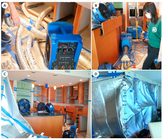 (A–D) Heaters (A) with distribution manifolds (B) and flexible duct pipes, and fans in place for heated air circulation (C). A treatment zone covered with a thermal blanket to contain the heated air (D).