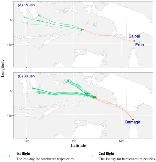Simulated effective backward trajectories showed the possible source and migrating pathway of S. frugiperda, which was found in Australia in 18 and 30 January 2020. Note: Green and red circle represent backward trajectory end-point for the 2nd day and the 1st day, respectively. (A) On 18 January 2020, (B) On 30 January 2020.