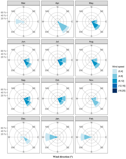 Circular histograms of monthly mean wind directions at 800–900 hPa during 20:00 to 05:00 on Saibai and Erub Islands and Bamaga from 2010 to 2019. Note: The area of the color segments is proportional to the number of occasions when wind directions fell within each 22.5° bin. There are 1500 points in each histogram (3 locations, 5 altitudes, 10 h, 10 years).