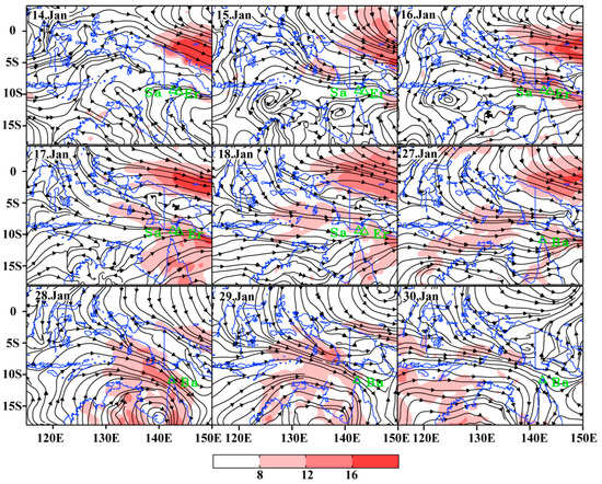 The influences of weather conditions on the migrating and landing for fall armyworm during January 2020 were further analyzed. On 14 January, wind direction in the Torres Strait was scattered and the wind speed was less than 8 m s−1. The wind speed at Saibai and Erub Islands was only 3.31 m s−1 and 3.96 m s−1 respectively. Strong westerly wind from southeast Indonesia to the Torres Strait commenced since 15 January. The wind speed at Saibai and Erub Islands increased to 11.23 m s−1 and 10.41 m s−1 on 16 January, and wind speed above 10 m/s remained during 17 to 18 January (Figure 3). Similarly, a strong westerly wind prevail in the Torres Strait due to the influence of a tropical cyclone from 27 to 29 January, with average daily wind speeds of 10.08 m s−1, 13.38 m s−1 and 9.51 m s−1, respectively (Figure 3). Therefore, there was suitable carrier airflow in the Torres Strait during 16 to 18 January and 27 January to 29, to enable fall armyworm to complete a long-distance migration across the sea.