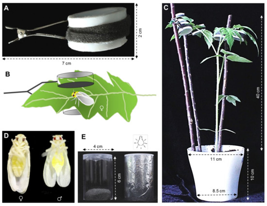 Experimental setup. (A) Clip-cage; (B) A female whitefly was contained in one clip-cage attached to one tomato abaxial leaf; (C) Five clip-cages in which a female whitefly respectively attached to tomato plant; (D) Female and male whiteflies; (E) Feeding chamber, dsRNA is contained between two layers of parafilm in the end of glass feeding tube. After whiteflies are released into the other end of the tube, the tube is sealed with a black cotton plug, covered with tinfoil, and oriented with the parafilm-covered end toward a light source about 0.5 m away in whitefly rearing room for feeding 48 h.