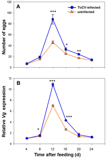 Temporal change of whitefly fecundity and Vg expression on ToCV-infected and uninfected tomato plants. (A) represents the dynamic change of egg numbers within 24 days (Mean ± SE, n = 30); (B) represents the dynamic change of relative Vg expression within 24 days (Mean ± SE, n = 30). The asterisks above bars mean significant difference: * p ≤ 0.05, ** p ≤ 0.01, *** p ≤ 0.001. Data were pooled with 3 replications.