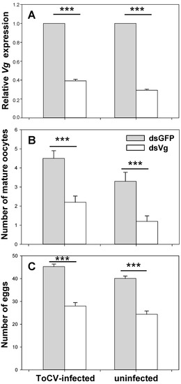 ToCV infection increased the number of mature oocytes, while dsVg decreased it. The number of mature oocytes in whitefly on ToCV-infected plants (dsGFP: Mean = 5.000, SE = 0.307; dsVg: Mean = 2.000; SE = 0.243; Figure 4A,B) was significantly more than that on uninfected plants (dsGFP: Mean = 3.000, SE = 0.330; dsVg: Mean = 1.000; SE = 0.223; Figure 4C,D) (fed with dsVg: t (28) = 3.035, p = 0.005; dsGFP: t (28) = 2.810, p = 0.009), indicating faster ovary development. Whiteflies fed with dsVg possessed significantly less mature oocytes than dsGFP treatments no matter on plants infected with ToCV or not (uninfected: t (28) = 5.187, p < 0.001; infected: t (28) = 5.965, p < 0.001) (Figure 3B).