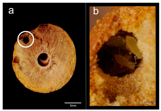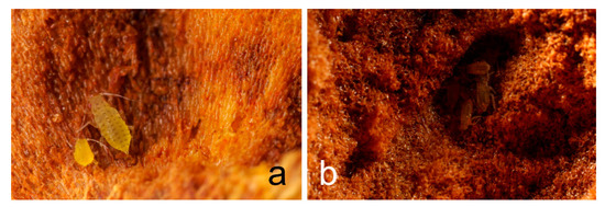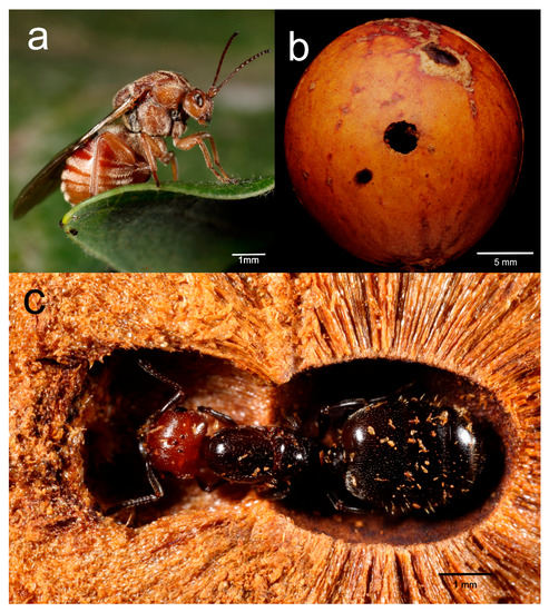 Panaphis juglandis (a,b) at different stages of development, still alive and with no signs of damage caused by ants inside a gall nest of C. scutellaris.