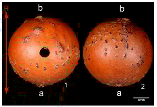 Galls used for the survey were divided into two halves (1, 2) according to the height line (H), keeping the hole produced by the emerging cynipid in the middle of one of the halves. The insertion point of the gall is also shown on the tree branch (a) and the opposite peak (b).