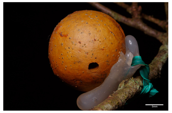 The field survey and the experiment were conducted in Northern Tuscany (Italy) near the village of Fornoli (MS- 44°15′15.1″ N 9°58′01.8″ E). During the study, only galls induced by A. kollari (Hymenoptera: Cynipidae) (Figure 1) and located on Quercus spp. mature trees were selected. Galls were identified by their external morphology, characterized by smooth aspherical bright-brown structure, perhaps with a surface bump [1].