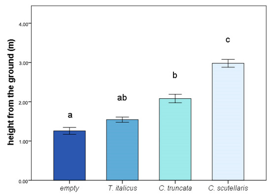 Significant differences were recorded when considering the relationships between gall height from the ground and colonizing ant species (n = 79; F3,75 = 65.16, p < 0.001). Pairwise comparisons highlighted that the C. scutellaris gall’s height was statistically different from all the other categories (showing the highest values, Mean ± SE; 2.97 ± 0.09 m; 0.002 < p < 0.001). The height of the empty galls (showing the lowest values, Mean ± SE; 1.2 ± 0.08 m) and C. truncata galls (Mean ± SE; 2.08 ± 0.10 m) were significantly different one from the other (p = 0.003), but no significant difference was found when each was compared to T. italicus (Mean ± SE; 1.5 ± 0.06 m; 0.63 < p < 0.25) (Figure 4).