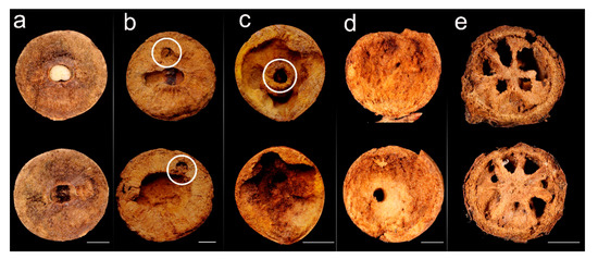 Inner architecture of galls colonized by C. scutellaris and C. truncata. The effect of different colony composition and the presence of aphids are shown in the two halves of the gall: (a) gall still occupied by the cynipid; (b) Qa (queen and aphids), showing evidence (circled) of the chamber where the aphids were found (1); (c) Qwba (queen, workers, brood and aphids), showing evidence of an aphid chamber (2); (d) W, the gall was completely excavated by the ants and presented a main central chamber only; (e) gall colonized by a single C. truncata queen. Scale bars: 5 mm.