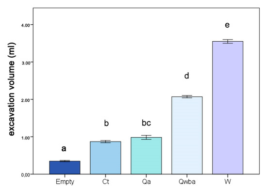 The analysis of the excavation volume in galls colonized by ants showed significant differences between the categories of colony composition (one-way ANOVA: F4,17 = 758.13; p < 0.001). Tukey’s tests showed four different groups, with the largest volumes being associated with galls with workers only (W), and a queen, workers, brood and aphids (Qwba) of C. scutellaris. Moreover, there was no difference between C. scutellaris queen and aphid, and queen of C. truncata only (Mean ± SE; empty 0.34 ± 0.03 mL; Qa 0.98 ± 0.05 mL; Qwba 2.07 ± 0.03 mL; W 3.55 ± 0.05 mL) (Figure 7). The smallest volume inside the gall was recorded for empty galls (Figure 7). No differences were detected in excavation volume analysis of the aphid chamber in galls colonized by C. scutellaris with a queen only, and with a queen, workers and brood (one-way ANOVA: F1,9 = 122.85; p = 0.610; Mean ± SE; Qa 0.10 ± 0.006 mL; Qwba 0.14 ± 0.047 mL).