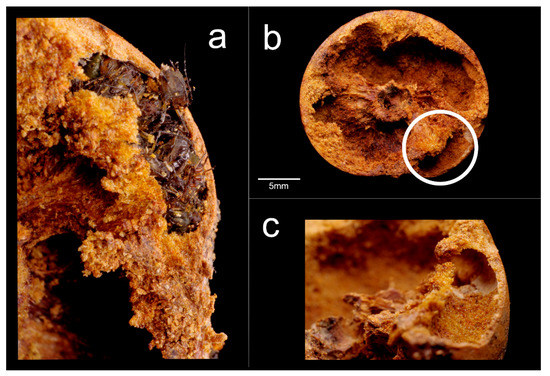 (a) Aphids inside the chamber in a Qwba gall nest of C. scutellaris—all aphids were still alive at the moment of checking; (b) section of the gall showing the chamber’s elongated shape, highlighted by the circle; (c) detail of the entrance hole connecting the aphid chamber to the rest of the excavated area occupied by the ants.
