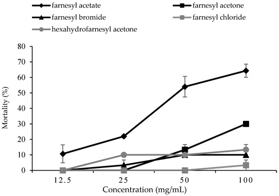 Percentage mortality of P. xylostella treated with farnesyl derivatives at various concentrations at 96 h. Data are shown as the mean ± standard error (SE).